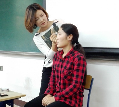 讲座的后半部分,丁水莲老师现场邀请了两位同学做模特,分别为她们化妆、作发型设计,边操作边讲解,一步步地为同学们展示了化妆的具体步骤,并根据两位女生的风格介绍了合适搭配的服饰。老师娴熟的手法,规范的讲解,亮丽的化妆效果让在场同学为之惊叹。在此过程中,同学们也积极地向老师提问有关自己在面试妆容、服饰搭配、发型设计方面的难题,丁水莲老师耐心地给予解答并提出相关建议。最后,丁水莲老师还邀请了部分同学亲自上台实践,大家都踊跃参加。现场气氛十分积极活跃。