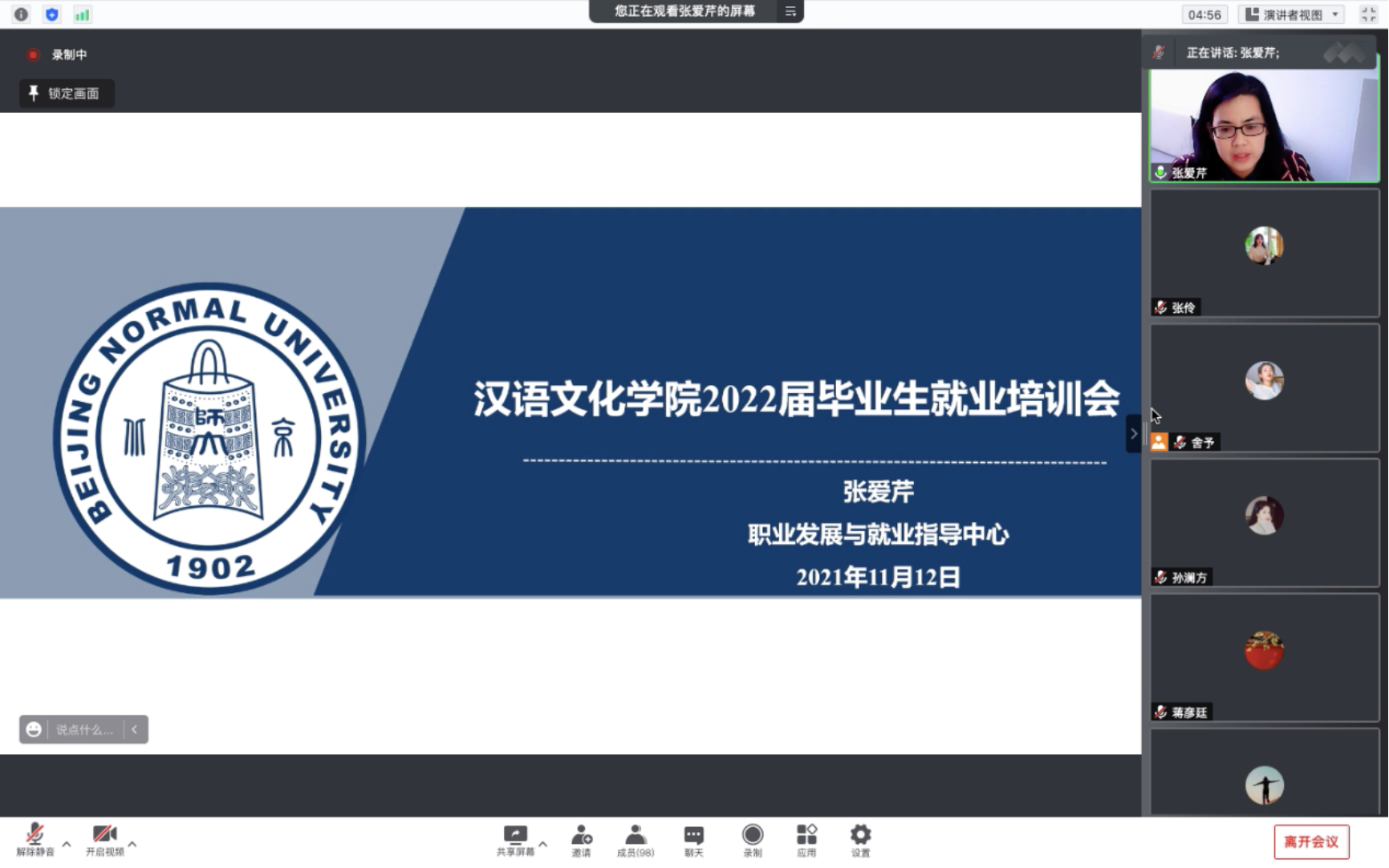 动员会围绕就业培训和形势分析两个主题展开。首先,张爱芹老师以公司就业指导中心提供的平台服务为依托,强调了主要双选会、招聘会时间节点,从就业信息发布与宣传方面为毕业生们介绍了就业中心官网、北师大英才公众号、学部院系就业联络群等就业信息渠道与搜索工具,并重点解读了基层选调、“四有”好老师起航计划等相关就业政策,为同学们全方位地解读了今年的就业安排。