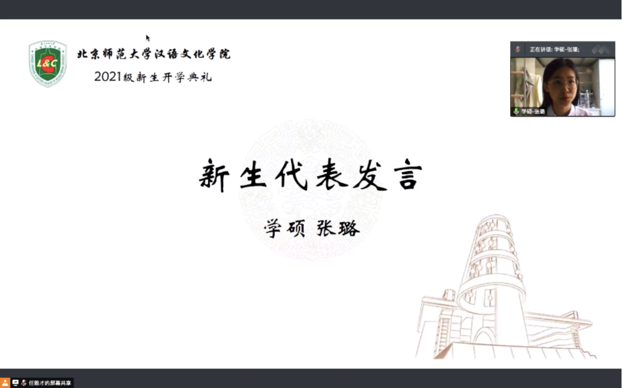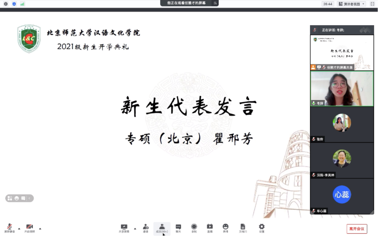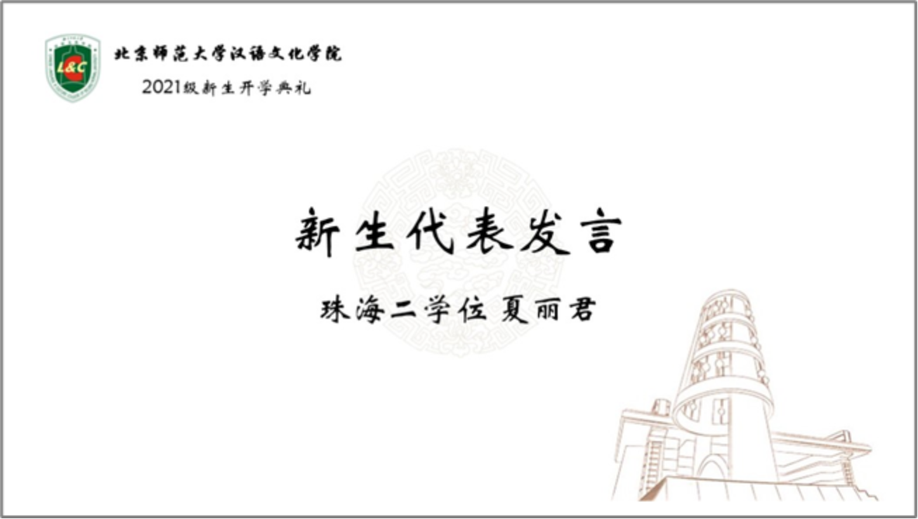 随后,博士生冯双艺同学、学硕张璐同学、北京校区专硕瞿邢芳同学、珠海校区专硕宋可凡同学和珠海校区第二学位本科生夏丽君同学作为2021级新生代表发言。