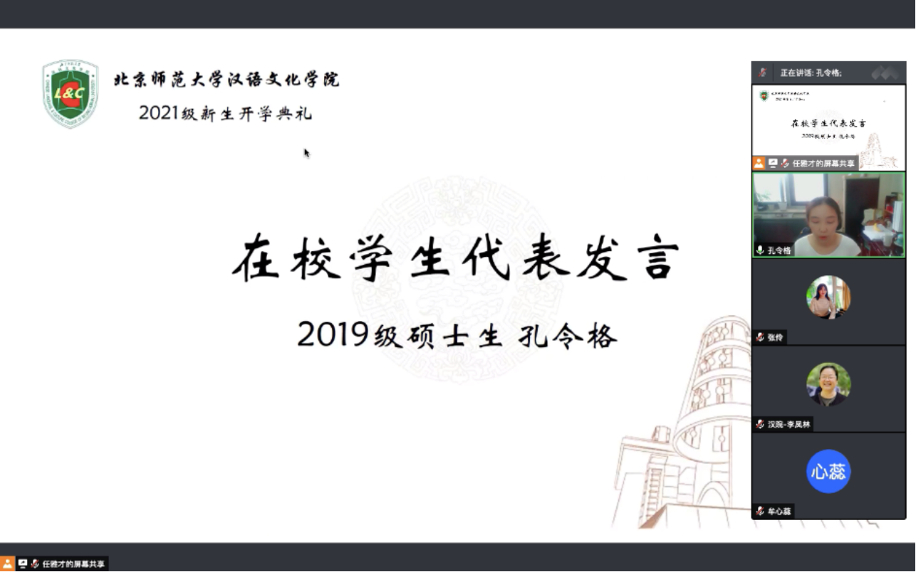 2019级硕士生孔令格同学借用三句文采斐然的诗词分享了自己在汉院两年来的求学感悟,并对在场的硕博新生给予了真诚的祝福。希望大家保持“为者常成,行者常至”的勇毅,激扬永远奋斗的精气神,努力成为勇担时代使命的京师汉院人。