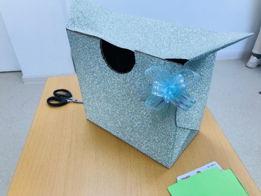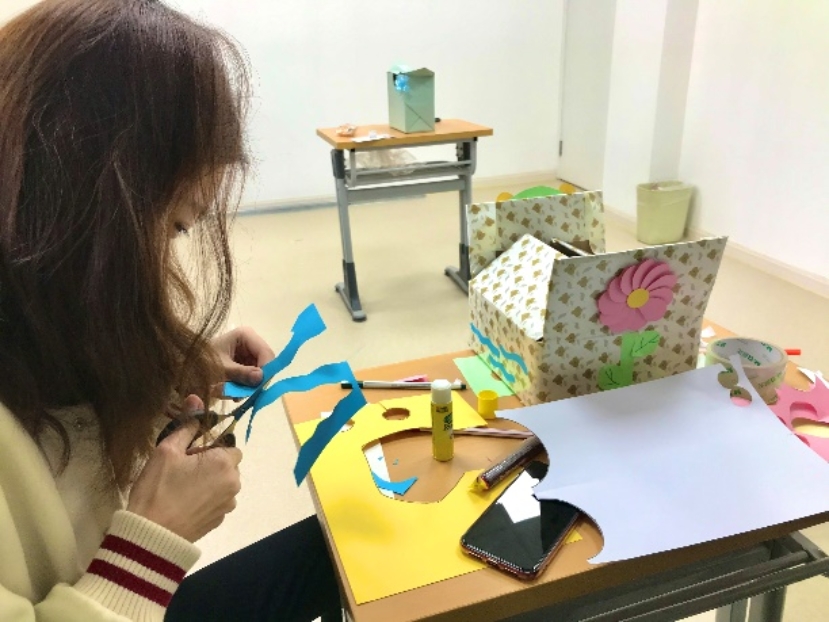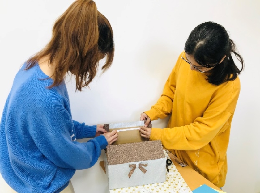 “情绪百宝箱”是一种当使用者出现低频情绪时,帮助使用者迅速提升情绪的物品。本着节约的原则,同学们将用过的快递盒回收,利用卡纸、胶带等工具,发挥奇思妙想进行创作。箱中会放入各种各样的卡片,卡片上写着暖心治愈的话语和令人心情愉快的建议。