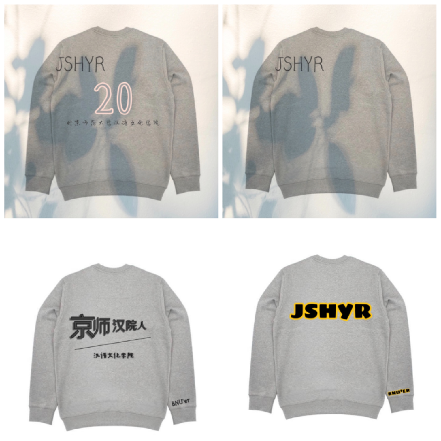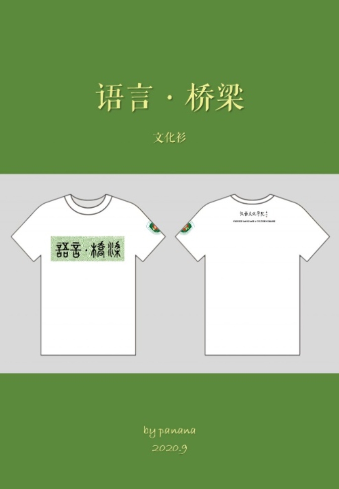 文化衫:中心为取自《说文解字》篆文的“语言·桥梁”字样,底色为墨绿色祥云,左肩为院徽,背面顶部分别为启功先生所题“英国威廉集团官网”书法与汉院英文“CHINESE LANGUAGE & CULTURE COLLEGE”。