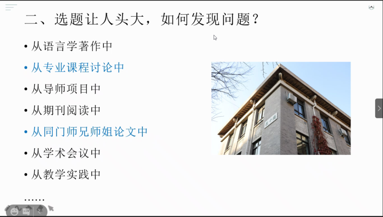 刘露蔓师姐主要针对专业硕士生的开题报告撰写进行分享。她以开题报告及论文撰写常遇到的瓶颈——理论基础薄弱、教学实习转为线上、研究方法薄弱等为切入点,围绕——开题报告框架介绍及撰写方法、如何发现问题、如何使研究高大上、专硕开题tips四个部分对开篇中的问题予以详尽地回应。分享中谈到的具体如高效利用图书馆信息素养讲座、细节如文献阅读的分层次阅读方法、文献管理软件Endnote的使用均可操作性极强,使同学们获益匪浅。