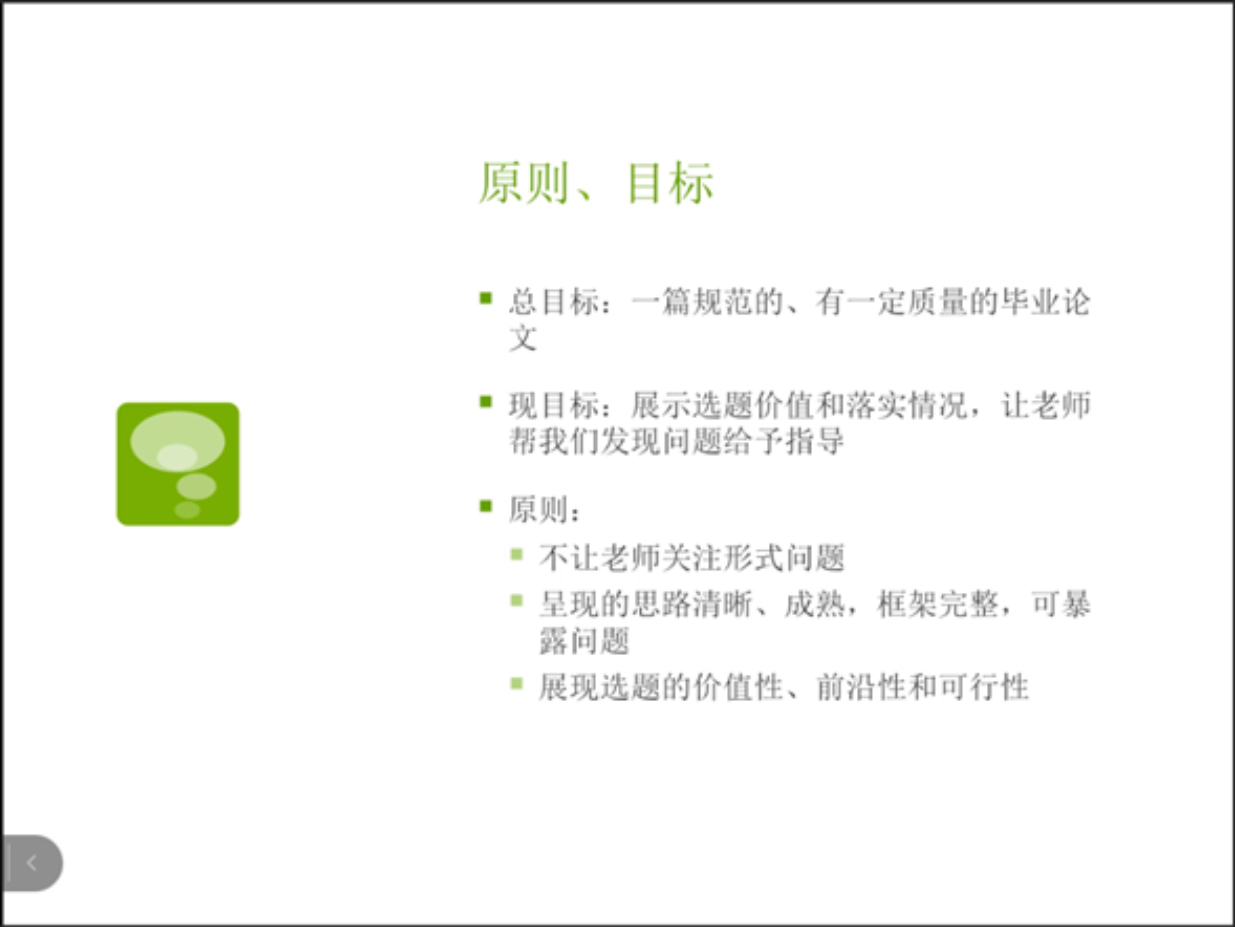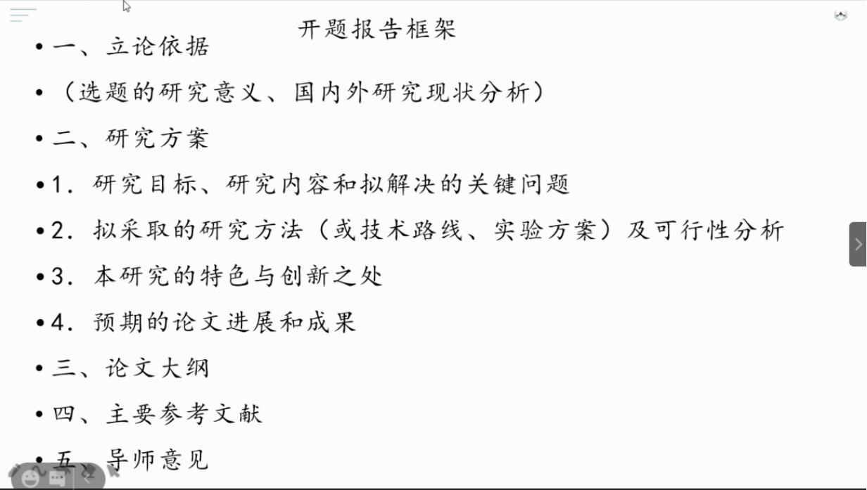 肖慧敏师姐在开篇中指出,开题报告实质是对自己现阶段研究的落实情况的一个汇报,有别于毕业论文,但与毕业论文的质量直接相关。随后,从目标原则、如何准备开题、如何撰写开题报告三个方面进行了分享。师姐在分享中提出很多创见,例如:在第一部分中指出开题报告是寻求老师指导的重要时机,因此应当在形式、思路上不出错,才能获取更多有价值的帮助;在第二部分中指出选题是一个贯穿整个论文撰写的过程,会在写作研究中不断调整;在第三部分中指出实证性研究的开题从研究方案切入比较高效,文献综述撰写应当将答辩老师定位为读者、注重导向自己的研究等。