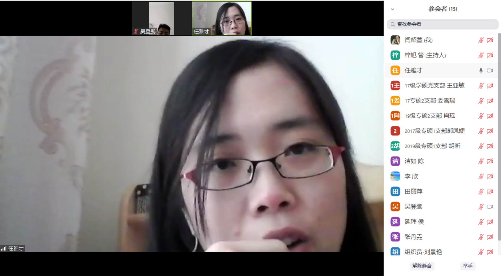 最后,任雅才老师总结会议,并对党员提出三点要求。一是提高政治站位,强化责任担当。积极配合国家、公司的防疫工作,令行禁止。二是提高党员意识,发挥党员模范带头作用。第一时间关注、学习公司下发的防疫文件,力所能及地参与防疫工作,将爱国主义落到实处。三是帮助身边同学,营造良好环境。各级同学都面临着不同的机遇和挑战,在这样的特殊时期,更要加强与同学的联系和沟通,互助共进。