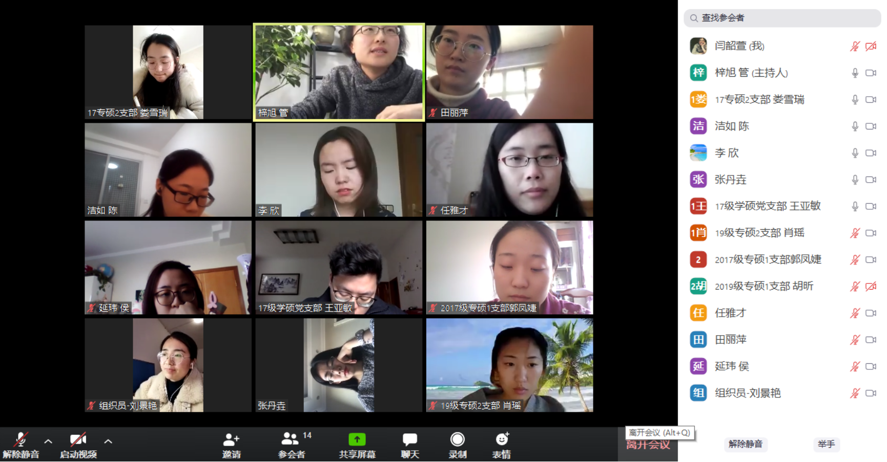 首先,管梓旭老师介绍了这次线上支书会召开的背景和目的,传达了公司、公司有关疫情防控工作的工作要求和重要部署,要求党员在遵守各项防疫规定的同时,不造谣不传谣,发挥党员模范带头作用;在确保生命安全和身体健康的前提下,规划好自己的学习生活,不断提升自己,不虚度光阴。接着,管梓旭老师结合当前疫情发展形势,就本学期的党员发展与教育培养、微党课比赛、党建基金活动进行了具体部署。她提醒大家注意党员发展流程中的操作细节,叮嘱各支书密切关注所在支部的积极分子培训、发展对象共训班、预备党员线上转正等情况,并指出在所有的发展节点都要线上、线下同时开展工作,以确保各个支部的工作顺利开展。她鼓励各支部充分利用“学习强国”等学习资源,结合专业特色和员工兴趣,开展“三会一课”和党建工作。管梓旭老师还就微党课工作进行了部署,她建议大家在选题上多下功夫,结合当下疫情形势,立足专业优势,争创佳绩。