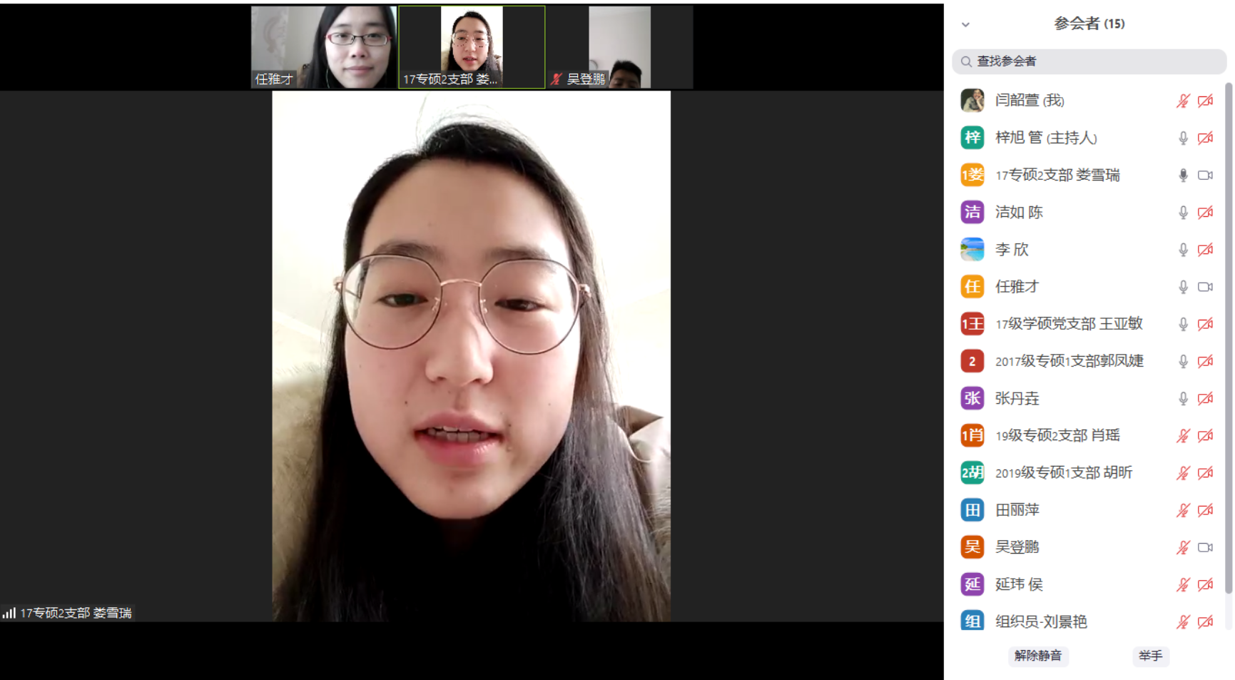 接着,2018级学硕党支部书记陈洁如向大家分享了支部工作经验。她介绍了这学期支部工作的变化,即进行一段时间的线上工作。在这样的情势下,支部内部的协作、支部和党委的交接等工作都面临着挑战,也更需要大家密切配合、团结协作。另外,她就党员发展工作规范、党建系统信息更新、党员发展材料审核等相关环节分享了经验。她认为让申请入党的同学熟悉入党流程、加强沟通,可以有效提高党员发展工作的效率。最后,她建议各支部整合资源,开展跨公司、跨支部的党建活动,以促进共同学习和进步。