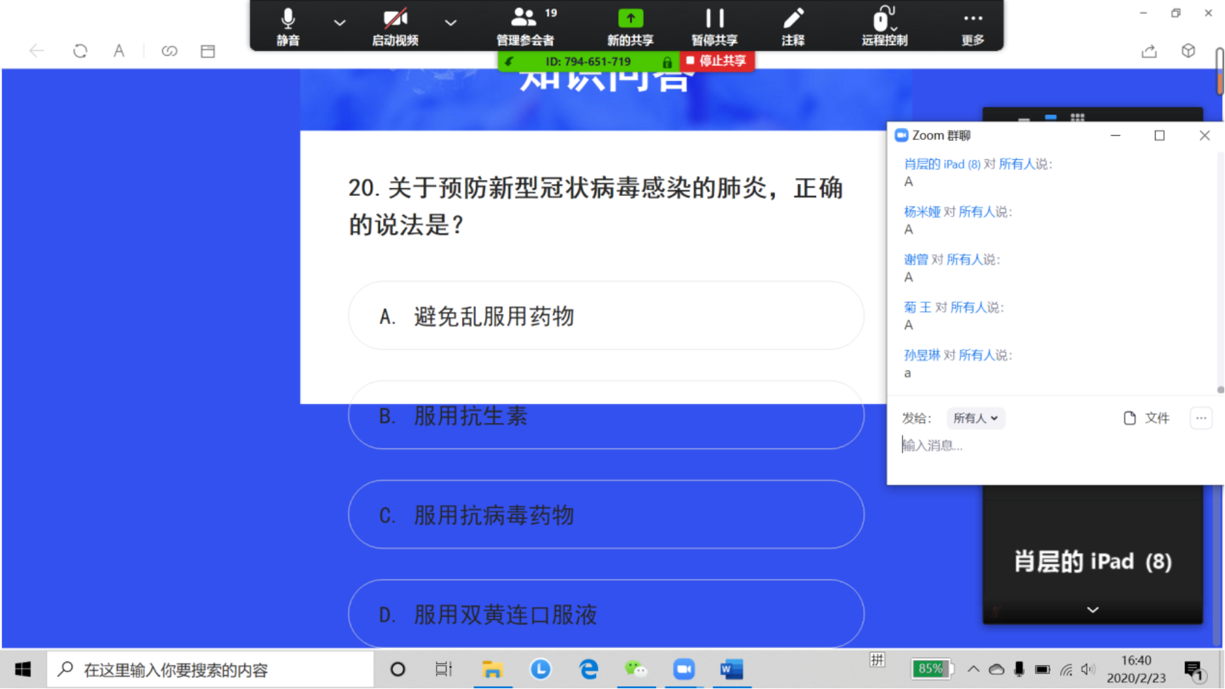 读书分享会结束后,大家还通过线上平台一起完成疫情知识问答,共同商讨问题答案,深入了解相关知识。