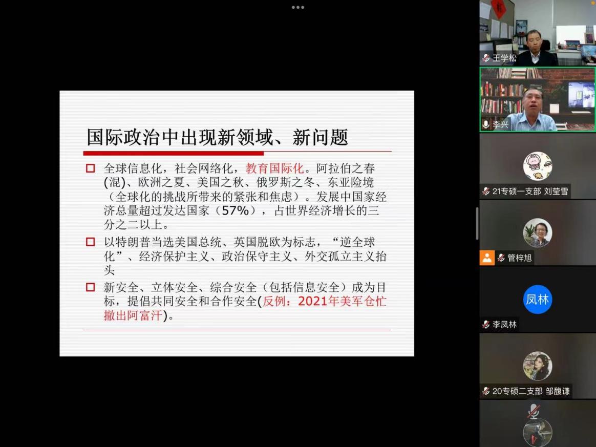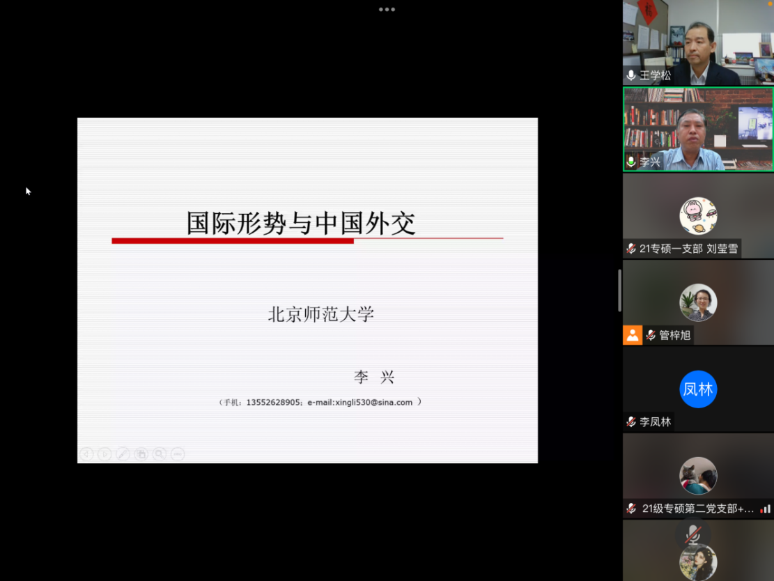李兴教授对国际形势与中国外交的解读,使参会师生获益匪浅。在新的历史征程上,我们将继续朝着构建人类命运共同体的目标奋力前行,为中国、为世界做出更大贡献,为历史、为未来书写更新篇章!
