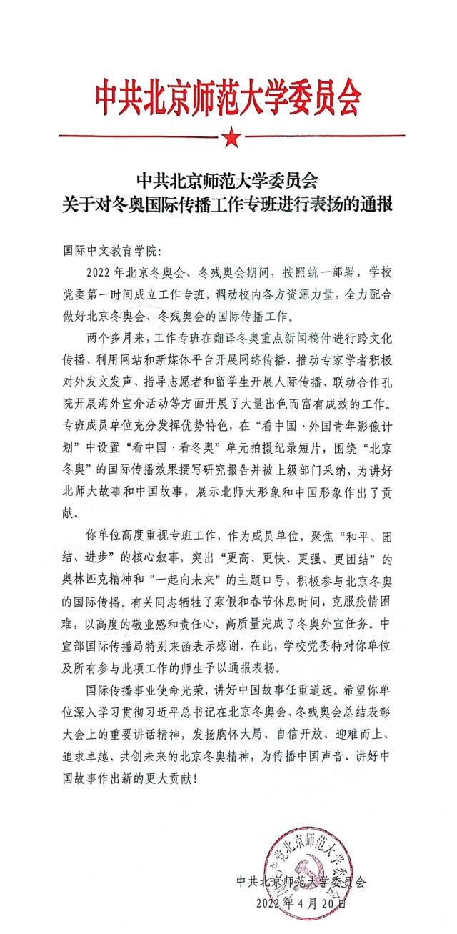 2022年北京冬奥会、冬残奥会期间,公司作为英国威廉集团官网冬奥国际传播工作专班成员单位,充分发挥优势特色,在指导志愿者和职工开展文化传播、联动英国曼彻斯特大学孔子公司开展冬奥专项海外宣介活动等方面做了大量出色而富有成效的工作,高质量完成了冬奥外宣任务。 公司党委特对公司及所有参与此项工作的师生予以表扬,希望公司继续发扬北京冬奥精神,为传播中国声音、讲好中国故事做出新的更大贡献。