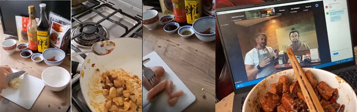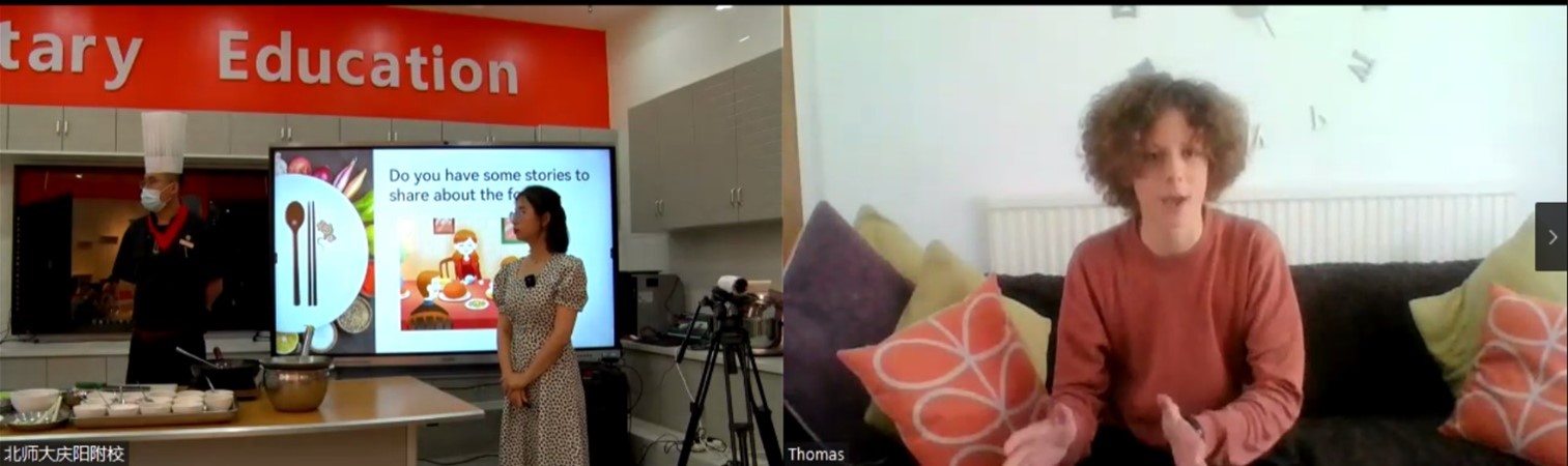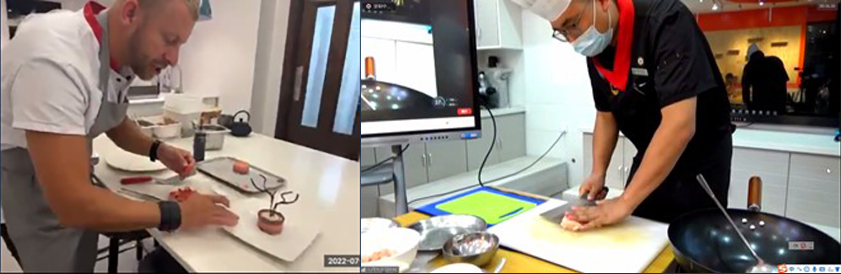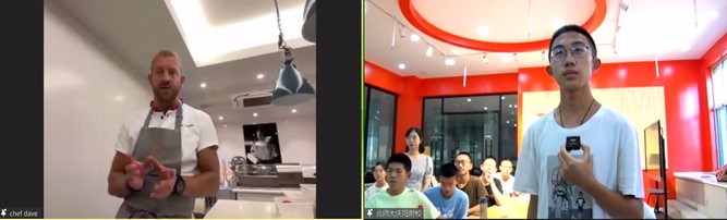 在美食主题中,庆阳附校的老师讲授中华美食方面的知识,并由技能教师在公司餐厅进行现场教学,教授“宫保鸡丁”的制作方法。英方营员跟随中方教师,一步一步学着制作宫保鸡丁。英方利物浦鲁班饭店的Dave主厨实境介绍鲁班饭店的中国文化元素,并现场制作融合中华文化特色的甜点。展示讲解之后,中英双方营员现场连线主讲教师,进行讨论交流。