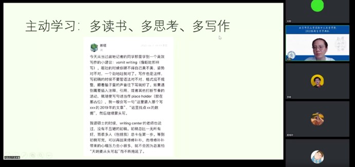 关于学习,柯老师提出了“主动学习”的建议。柯老师指出,研究生学习不同于本科,它更看重员工自主学习和研究能力的培养。所以,在研究生阶段,大家更应该注重培养自己的研究意识,主动学习,多读书、多思考、多写作,为今后的职业生涯奠定基础。