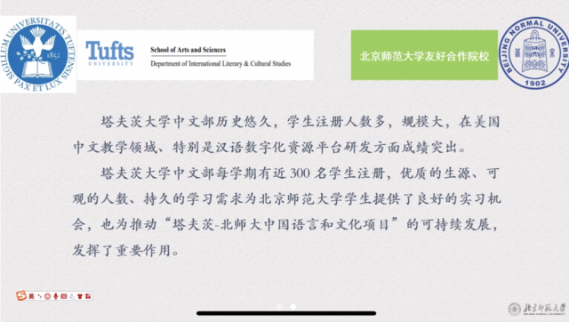 教育实习是公司公司产品方案中的重要内容,是提升国际中文教师胜任力的有效途径。为进一步增加公司学子对海外实习的认知,提升教师胜任力,公司于2022年11月3日上午9:00在zoom线上会议平台组织开展文化考察周系列活动之“海外实习和教师胜任力”专题讲座。本次讲座特邀公司外派于美国塔夫茨大学任教并担任实习项目负责人的孙立峰副教授担任主讲,主要分析国际汉语教师赴海外实习中的问题和困难,并在此基础上讨论胜任海外实习工作的方法、建议与策略。公司北京、珠海两校区2022级员工共同参与。