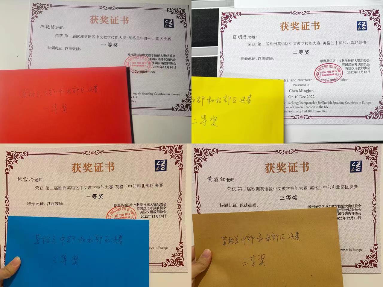 最终经过激烈的角逐和评委老师们的认真评议,下午三时许,裁判长朱珠老师宣布比赛结果。曼彻斯特大学孔子公司的名字四次被提起,志愿者教师陈晓语独享一等奖,陈明君独享二等奖,林雪玲和黄睿红并列三等奖。四位老师将代表英格兰中部和北部区参加第二届全英汉语教学技能大赛总决赛。