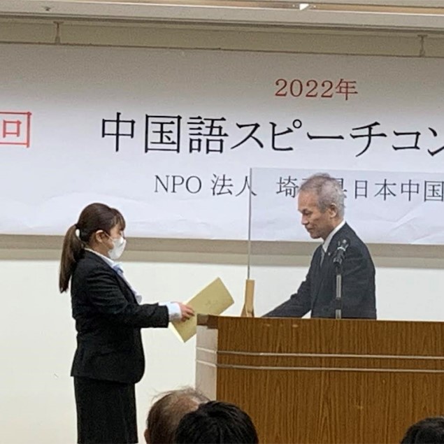 10月16日,在琦玉县第43届中国語演讲比赛上,中国语学科二年级员工滨野美玖同学在老员工组中获得“希望奖”。同时,她还获得了参加全国大会的出场权。滨野同学标准的汉语发音和声情并茂的演讲获得了大家的一致好评。