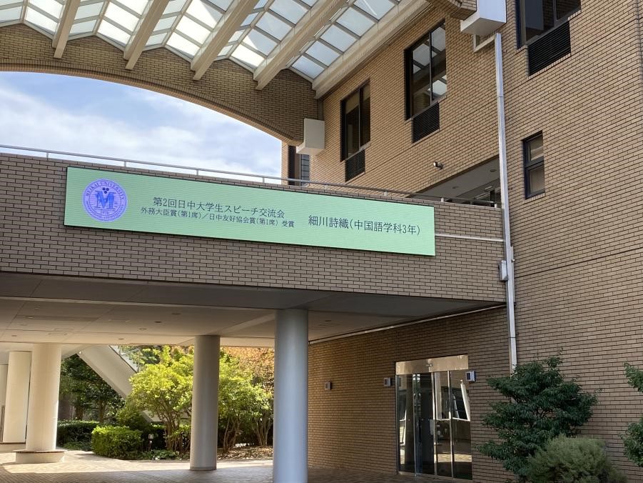 明海大学在校园显要位置打出了横幅庆贺细川同学获奖