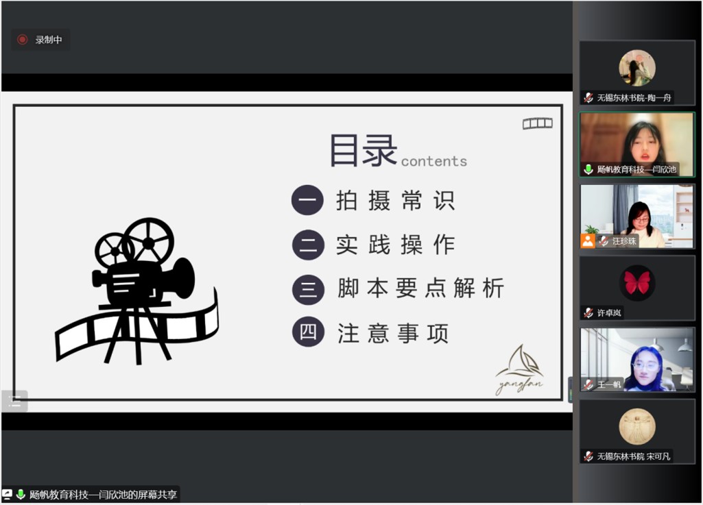 本次书院走访成果将以短视频形式展示,为提高同学们脚本撰写、视频拍摄及制作能力,公司请飏帆教育科技公司的闫欣池和王一帆老师进行拍摄指导。培训中,闫老师重点介绍了视频拍摄常用的构图方法、拍摄角度、运动镜头的种类及不同场景的镜头表达,并结合实地拍摄的亲身示范视频对建筑、景物、人像等不同拍摄内容和场景进行了详细的分析。此外,闫老师还就一些拍摄的注意事项,包括拍摄前的准备和测试,拍摄中素材的选用等进行进一步强调。