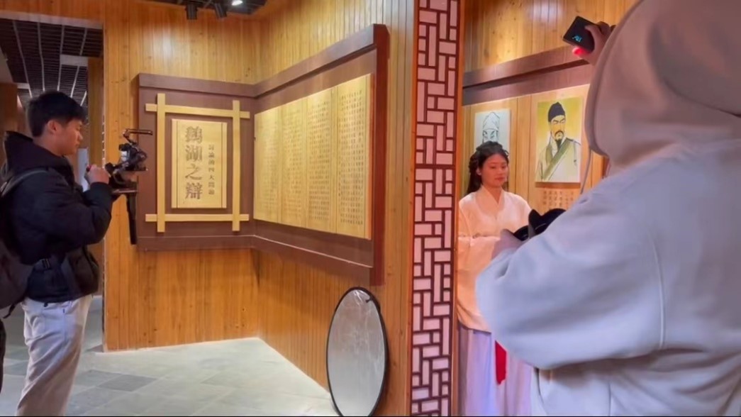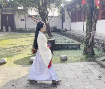 走访江西鹅湖书院的罗建英同学选择了穿汉服完成整个出境拍摄,当问及为什么要着汉服时,建英同学回答:“我觉得书院的古色古香和汉服的古朴典雅可以相得益彰,以这种装扮出镜也是想给观众带来更好的视觉效果,有带入感。”
