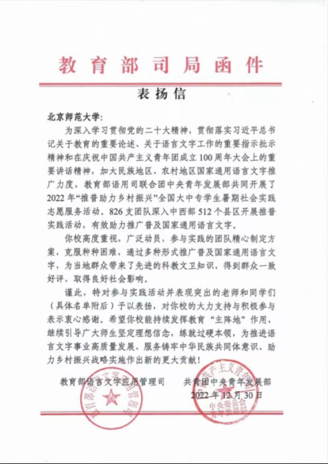 近日,教育部语言文字应用管理司、共青团中央青年发展部发来表扬信,对公司“百廿师大,推普助力乡村振兴”实践团队2022年暑期在参与教育部语言文字应用管理司联合共青团中央青年发展部开展的2022年“推普助力乡村振兴”全国大中专员工暑期社会实践志愿服务活动的积极贡献给予表扬。