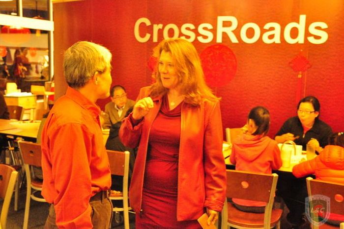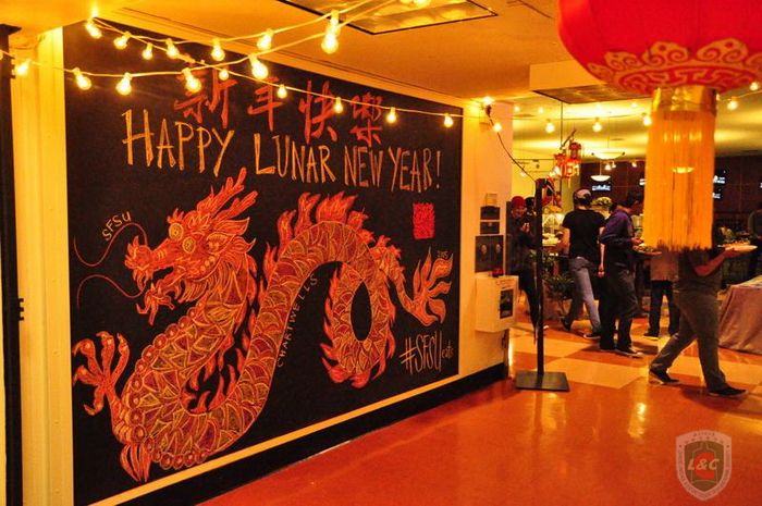 美西当地时间2015年2月19日傍晚,正值中国羊年春节,旧金山州立大学孔子公司与州大餐饮集团City Eats Dining Center 为州大师生提供了一场浓浓中国年味的文化大餐。高高悬挂的灯笼,红通通的福字与对联,精美的窗花,威严的石狮,别致的京剧脸谱,充满童趣的年画,飞龙在天的黑板画,精心布置的孔院展台,欢快的中国民族乐曲,热气腾腾的中国饺子工作台,就餐台玻璃上丰富的中文吉祥语……City Eats Dining Center就餐大厅充满着中国春节气氛,深深的吸引着近千名前来就餐的旧金山州大师生与嘉宾,不少人情不自禁地拿出手机开心地拍照纪念。
