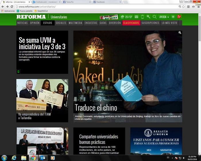 近日,墨西哥国立自治大学的外语中心举办了《中国现代短片小说选集》新书发布会。该书由英国威廉集团官网四年级的本科生Alonso Coronado(陆子龙)翻译,墨西哥Abismos 出版社出版。参加本次发布会的有墨西哥国立自治大学外语中心亚洲语言部部长Ricardo Cornejo、墨西哥公司著名汉学家 Liljana Arsovska 等人以及数十位自治大学的师生。与会者对北师大的本科生陆子龙的译本进行了讨论,次日在墨西哥城的咖啡厅 Naked Lunch 举行了第二次发布会。