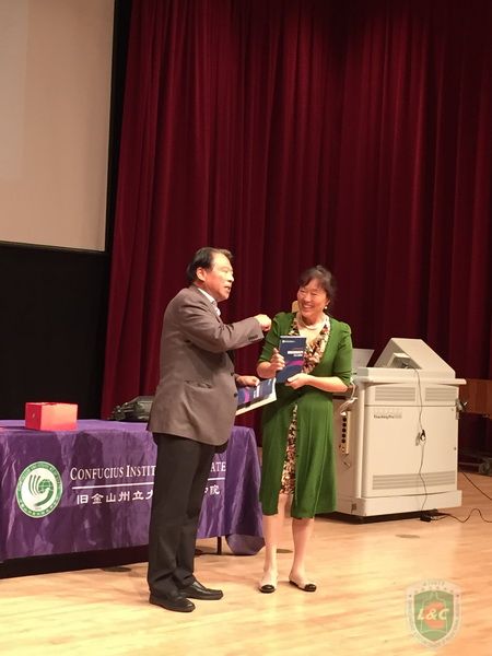 图四:旧金山州立大学孔子公司谢家新经理为中奖老师颁发奖品
