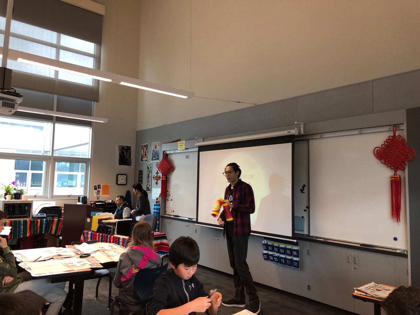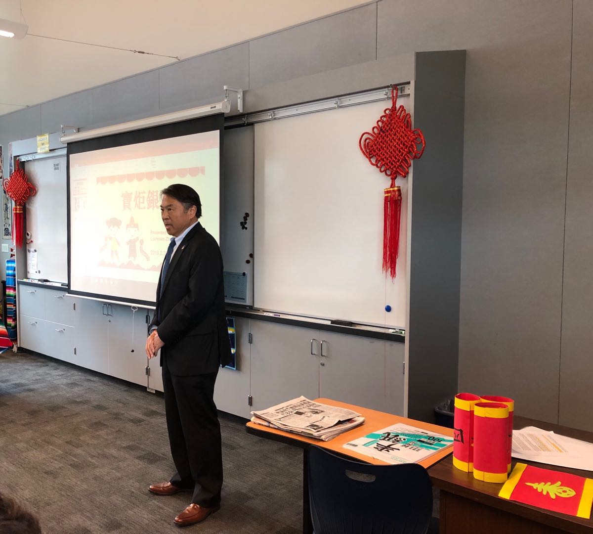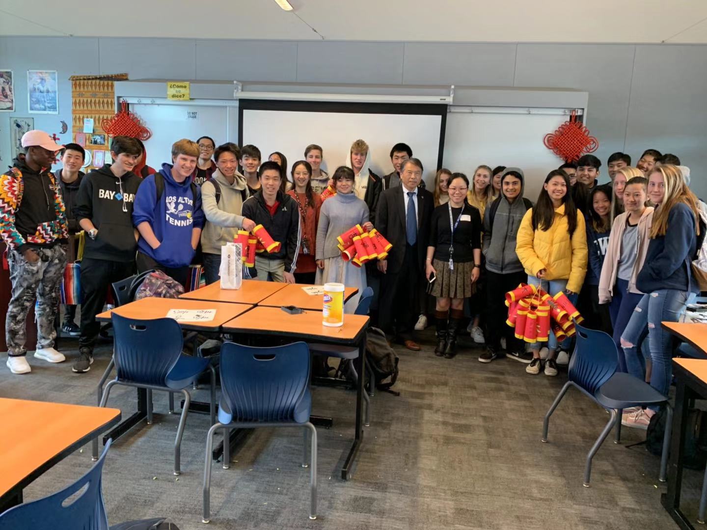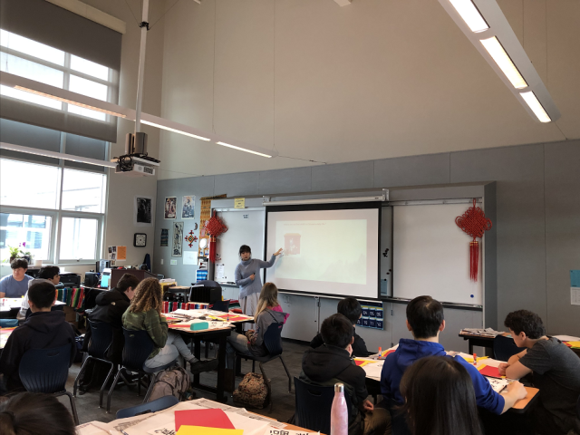 美西时间2月28日,受洛斯阿图斯高中(Los Altos High School)邀请,旧金山州立大学孔子公司谢家新经理带领杨天昊、张了原、姬淑欣三位中文教师参加该校“世界语言日”活动。孔院的老师们巧妙地以“吉祥爆竹”为本次工作坊的主题,将关于中国春节的习俗、书法、剪纸艺术和爆竹的手工制作结合在一起,有讲解有体验,既动手又动脑,在中国农历新年余韵未尽之际,把喜庆吉祥的中国文化带到美国中学的校园。