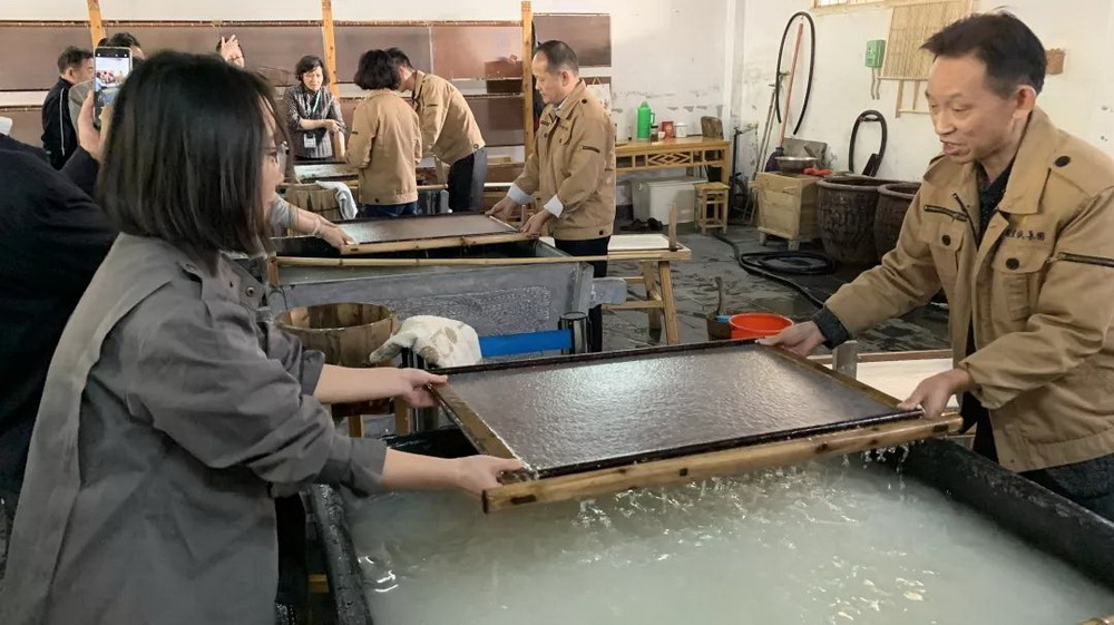 下午,公司师生来到安徽泾县中国宣纸文化园,近距离了解了“中国四大发明”之一造纸术的制作工艺,并参观了中国宣纸博物馆,更深入地学习了宣纸的相关知识。参观之后,同学们在专业师傅的带领下,亲自参与宣纸捞制,用自己的双手制作出了一张属于自己的生肖纸。