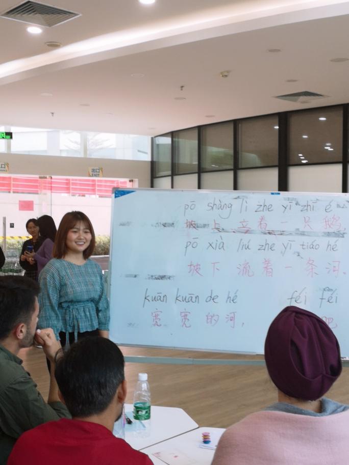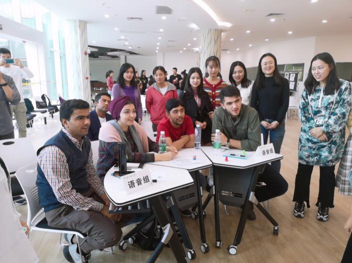 语音组的教学内容诙谐有趣,以绕口令为切入点练习韵母“e”。同学们耐心地一点点纠正职工的读音,可爱的职工们舌头“打结”依然坚持发音练习,有个职工“学霸”能读整段绕口令,还能翻译出大概的意思……他们让语音的课堂鲜活起来,中外员工不断地发现问题并解决问题,共同进步。