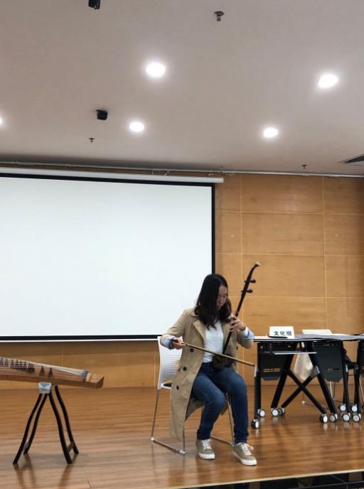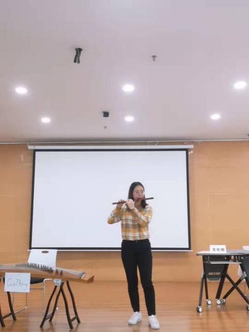 文化组的三位同学首先介绍了自己使用的民乐,然后向职工展示才艺,包括宛转悠扬、愁肠百转的古筝独奏《乡韵》,热烈欢腾的笛子独奏《金蛇狂舞》以及大气磅礴、奔腾嘶鸣的二胡独奏《赛马》。职工们沉醉在中国民乐的音乐创造力和表现力中,无形间缩短了与中国文化看似遥远的距离。