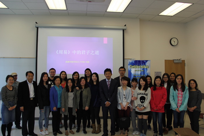第一场讲座安排在旧金山州大的人文楼,吸引了旧金山州大30多名师生与社会民众参加 。刘老师以《<周易>中的君子之道》为题,围绕四个核心关键词“元”、“亨”、“利”、“贞”阐释了《周易》的重要文化思想内涵、君子之道 。讲座引经据典,对孔子关于《周易》的重要言辞进行解释,在此基础上联系当今社会,指出《周易》思想对 当今社会与为人之道的多种启示。如当今社会存在的环境污染问题、权力寻租现象等都与人未能正确处理义利关系所致。在问答环节,刘教授针对师生提出的中华文化如何融入当地文化、算卦与算命的区别、“君子”涵义在不同时代社会的变迁等问题进行了解答,引发了热烈的现场互动。本场讲座促进了听众对《周易》深奥哲理的理解,激发了大家对国学的浓厚兴趣。